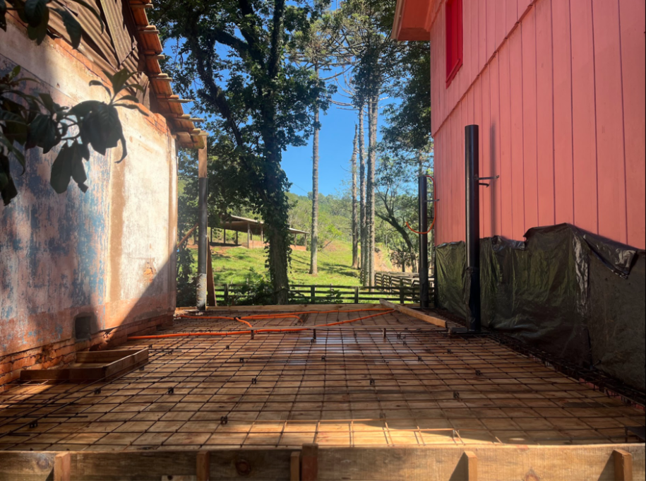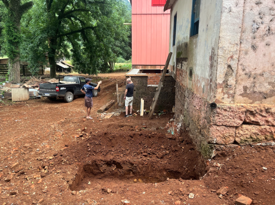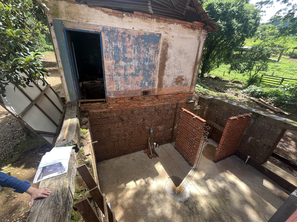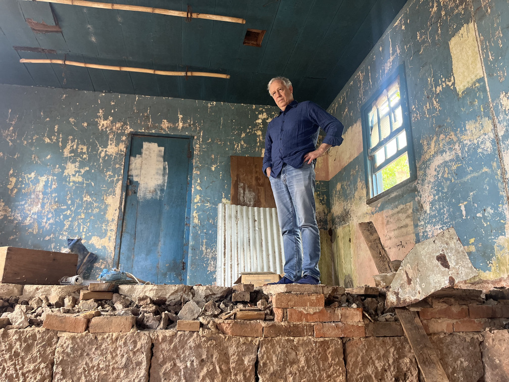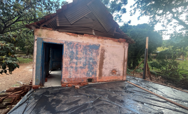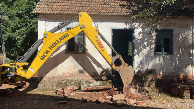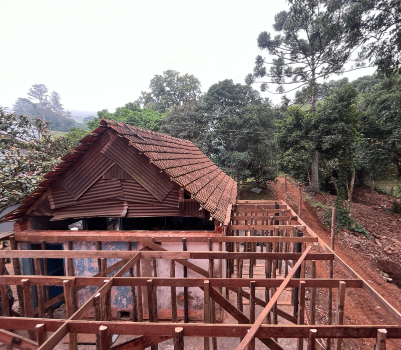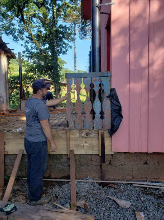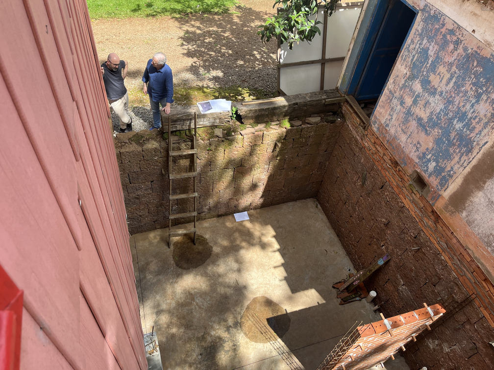 Visita Técnica e Preparação do Espaço O arquiteto Marcelo Ferraz realizou visita técnica junto à equipe responsável, orientando os encaminhamentos do restauro. Foram feitas limpezas, demolições e remoções necessárias para adequação do espaço, incluindo a preparação para acessibilidade e a reorganização dos acessos. Estrutura e Infraestrutura A obra avançou com a concretagem da laje do piso térreo, instalação de vigas, muros de arrimo e colunas de ferro fundido. Também foram implantadas as redes de água, esgoto e energia, consolidando a base estrutural da casa sem perder de vista o respeito ao traçado original. Preservação de Elementos Históricos (em andamento) Partes significativas foram retiradas para tratamento e posterior reintegração, como o forro da cozinha com sua pintura azul original. Elementos danificados, como o guarda-corpo, estão sendo refeitos com fidelidade às formas originais, preservando a memória do edifício. • Lei de Incentivo à Cultura • Pronac 237853 • Patrocínio master: Diamaju Agrícola • Realização: AAMoinhos e Ministério da Cultura - Governo Federal: Do lado do povo brasileiro.