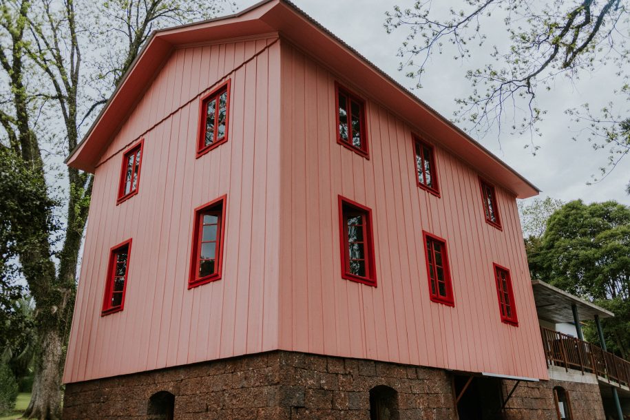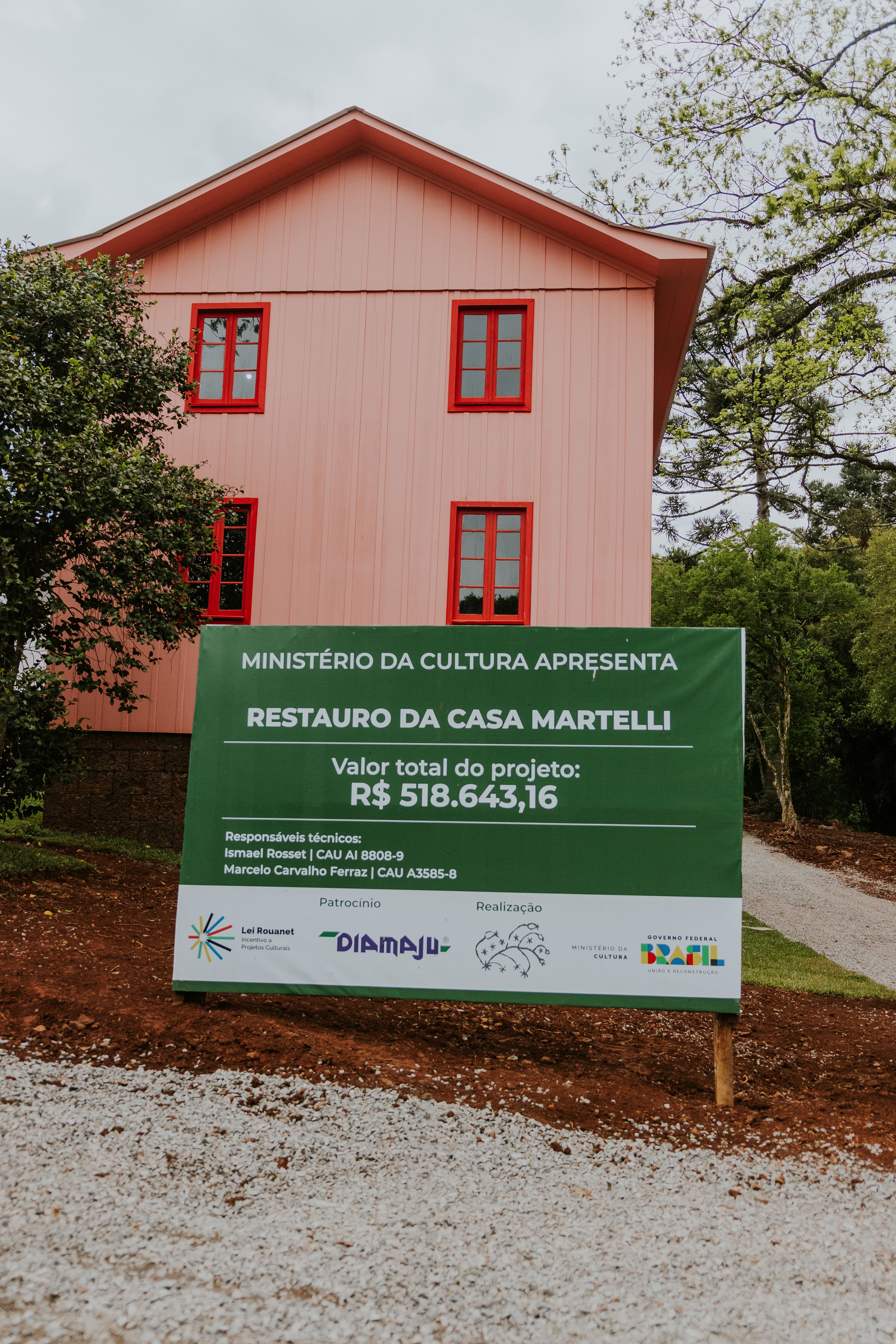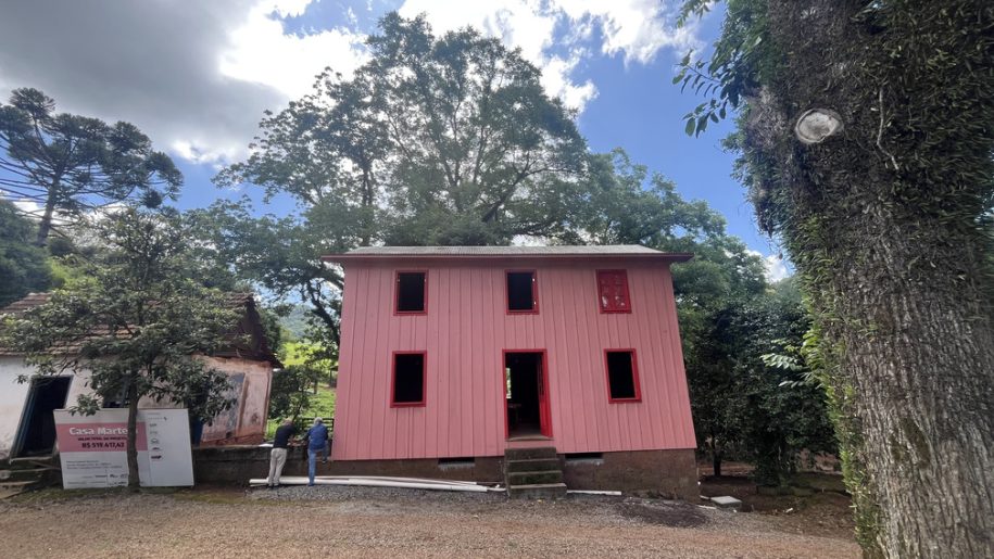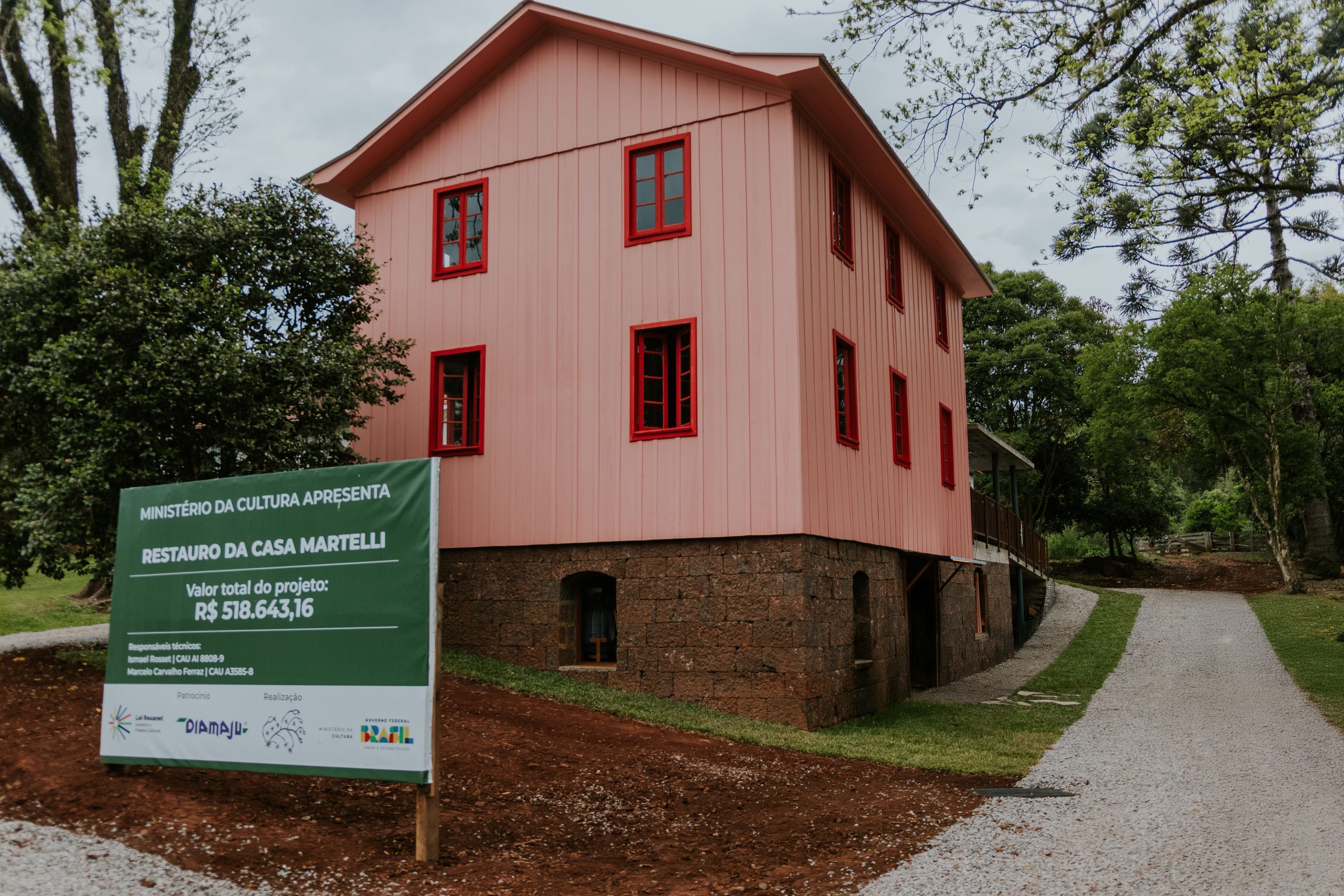 A primeira fase do projeto contemplou melhorias na casa principal, de madeira e no porão da Casa Martelli para instalação de um restaurante com capacidade para 50 pessoas. Os oito quartos da edificação abrem possibilidade para hospedagem, oferecendo ao público uma experiência bucólica de vivência no passado. A obra de restauro deste espaço foi realizada com financiamento do PRÓ-CULTURA, Governo do Estado do Rio Grande do Sul, que consistiu na limpeza do imóvel, lixamento e escovação das madeiras, das antigas aberturas, do alinhamento da estrutura e do piso e na substituição de algumas tábuas e de parte do telhado, está finalizada. “Removemos a madeira danificada nas paredes e substituímos por tábuas do mesmo tipo e espessura, assim como o telhado em aluzinco”, explica Ismael Rosset, arquiteto responsável pelo acompanhamento técnico local da obra. Já o “passadiço”, espaço que separava a cozinha da sala e dos quartos – uma característica da arquitetura colonial italiana para a proteção contra possíveis incêndios – foi removido para dar espaço a uma nova estrutura de acesso, mantendo a sua tipologia original. Testes de cor foram feitos para que o corpo da casa voltasse a ter a tonalidade rosada original e suas aberturas em vermelho. Marcello Ferraz, arquiteto da Brasil Arquitetura, escritório de São Paulo responsável pelo projeto de restauro, falou sobre a pintura. “O projeto visa o que será a casa, não o que já foi. É a liberdade das novas propostas. Mas como o tom rosado é algo que se quer respeitar, será mantido. O contraste da cor rosa com o verde da natureza é uma decisão de projeto que dialoga com o passado”, analisa. • Patrocínio Master: Diamaju Agrícola • Patrocínio: Agraz Refrigeração e Agrodalla • Realização: AAMoinhos • Financiamento: PRÓ-CULTURA, Governo do Estado do Rio Grande do Sul.